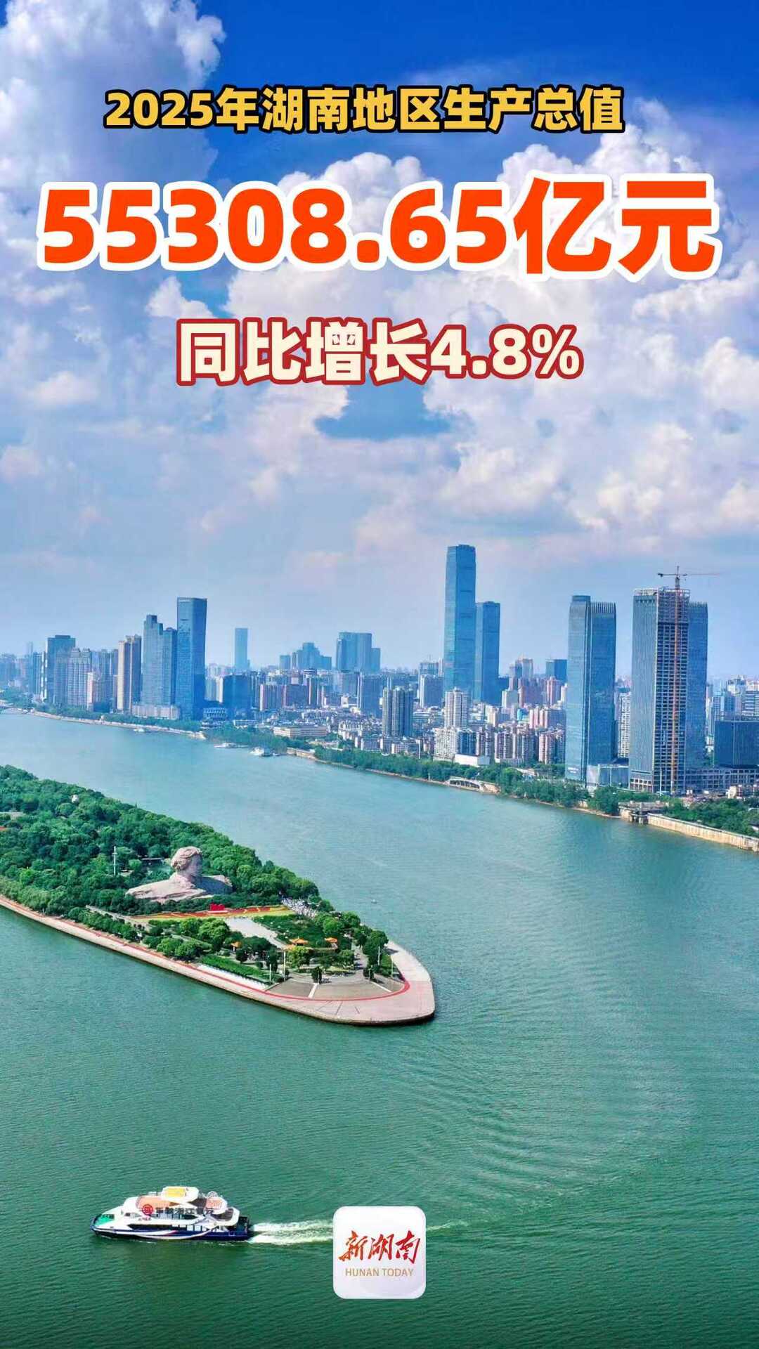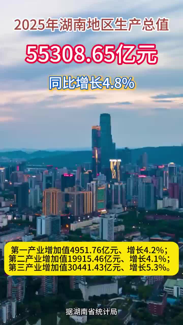 湖南日报1月26日讯(全媒体记者 王亮)今天,2025年度全省经济社会发展情况新闻发布会在长沙举行。记者从发布会上获悉,根据地区生产总值统一核算结果,2025年湖南地区生产总值55308.65亿元、稳居全国前十,按不变价格计算,同比增长4.8%。其中,第一产业增加值4951.76亿元、增长4.2%,第二产业增加值19915.46亿元、增长4.1%,第三产业增加值30441.43亿元、增长5.3%。